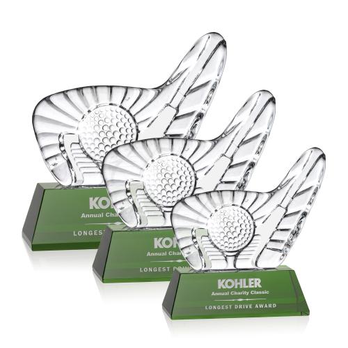 Our detailed crystal golf ball radiates victory, surrounded by a deep relief putter and mounted to a beveled green optical crystal base, highlighting any champion with classic elegance. 1 Colorfill Included.