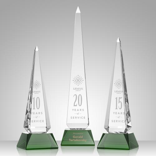 A dramatic Optical Crystal towering Obelisk to recognize the pinnacle of achievement. The statuesque Helmsley Award features a tapered bottom and is mounted on a brilliant Optical Emerald Base. Second Position Etch and Colorfill Optional.
