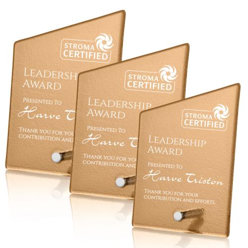 The budget busting Atchison awards feature an elegantly russet-colored frosted ice textured back with a smooth imprinted surface, perfect for recognizing excellence without breaking the bank. Available in various shapes and sizes and includes a chrome finished silver pin.
