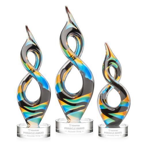 For a bold departure from the predictable, discover the captivating elegance of our Cosenzo Art Glass Award. Its flowing infinity-inspired form is a mesmerizing interplay of movement and balance, while vibrant ribbons of blue, teal, amber, and black swirl together in a dynamic dance of color. Each piece is individually hand-shaped and colored by skilled artisans, ensuring that no two are exactly alike. The solid optical crystal base offers a refined, etchable surface for logos, names, or messages, making it as personal as it is striking. Ideal as a decorative centerpiece or as an unforgettable recognition piece, the Cosenzo transforms any presentation into a visual celebration.