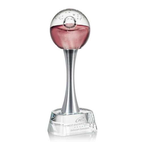 The Jupiter Award featuring a cosmic display of ruby red art glass and clear bubbles to create a majestic award to commemorate your special achievement. Perched atop a Brushed Aluminum pillar and Optical Crystal Willshire Base. Each piece is individually handcrafted and no two pieces are identical.