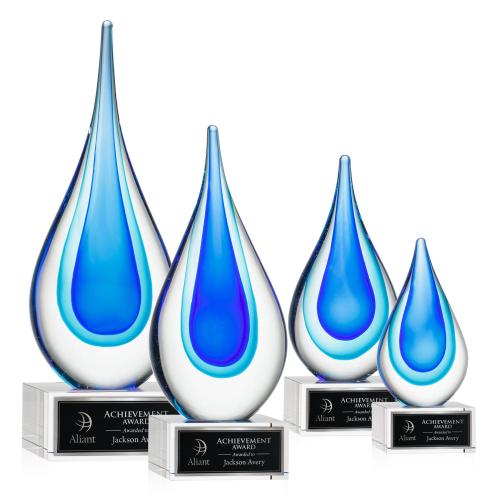 Clear glass surrounds this mesmerizing design with blue hues that form a complex teardrop shape. This captivating Marsielle Award is mounted to a clear crystal Hancock base with a laser engraved plate, creating a stunning recognition piece perfect to commemorate a landmark event or achievement. Packaged in a black satin-lined gift box.