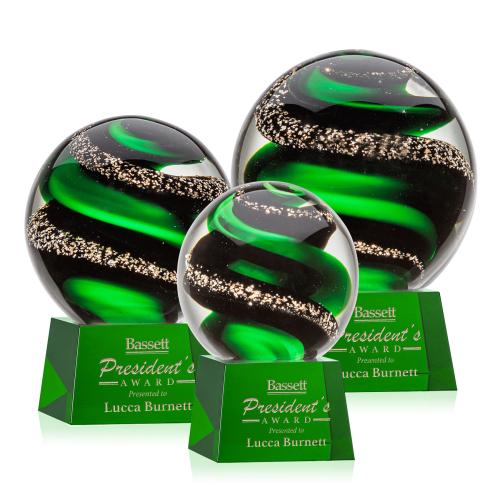 Magnificent Striking Zodiac Art Glass Award features twisting ribbons of emerald and glimmering black speckles. Mounted on a tapered Black, Green or Clear Optical Crystal Base. Each piece is individually handcrafted and no two pieces are identical. 1 Colorfill included in Black and Green bases.