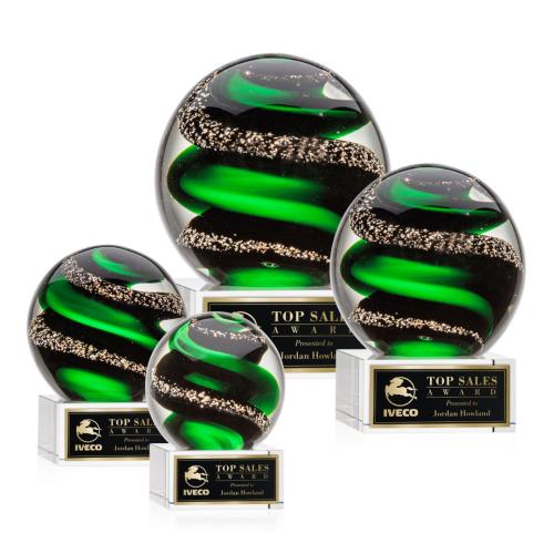 Magnificent Striking Zodiac Art Glass Award features twisting ribbons of emerald and glimmering black speckles. Mounted on an Optical Crystal Paragon base in clear, green or black. Each piece is individually handcrafted and no two pieces are identical.