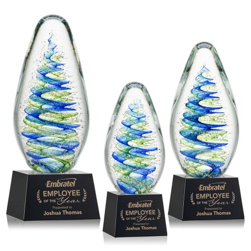 Elevate your recognition with our breathtaking blue and green swirl design art glass award, a stunning masterpiece hand-blown to perfection. Accompanied by your choice of base for personalized engraving with a logo or name, each piece embodies individuality and craftsmanship. Individually hand-crafted, no two awards are alike, ensuring a unique and captivating symbol of achievement for any recipient.