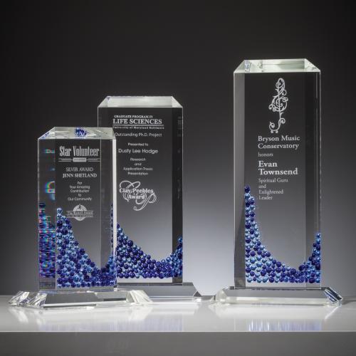 Beveled starfire crystal makes a bold statement of elongated crystal that is complimented with a round art glass mosaic pattern on the front and back in a combination of sapphire and aquamarine art glass. Each art glass drop is fused in kilns and applied by hand to create the wave of color surrounding the bottom.