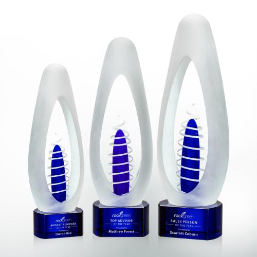 A tall egg-shaped frosted art glass with sheared polished sides creating a window into the sapphire center encompassed by a strip of swirling ivory.