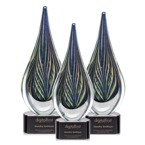Clear glass surrounds shades of iridescent art glass that form this peacock feather encased within a teardrop shape of glowing beauty. The sculpture is mounted to an ebony optical crystal base creating a stunning recognition piece perfect to commemorate a landmark event or achievement.