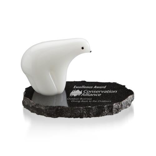 A stylized figure in opaque, polished white glass, the Polar Bear is a whimsical interpretation of the iconic arctic mammal. It is permanently affixed to a polished black granite base with irregular chipped edges. A lovely memento for environmental and conservation organizations or for anyone with a fondness for these magnificent creatures. This iconic arctic mammal comes in 4", 5" and 6" wide versions.
