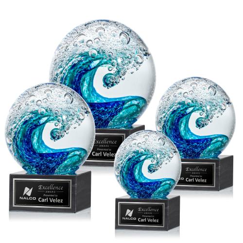 The magnificent Surfside Artglass award features a beautiful crashing blue wave embedded in a perfect sphere. Deep turquoise and sapphire interact with air bubbles to create a powerful and striking display to honor your achievement. Each art glass piece is unique and one-of-a-kind! All sizes are approximate and will vary from piece to piece. Mounted on a black square marble base and personalized with a laser engraved plate.