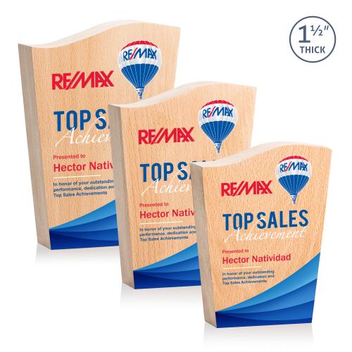 The **1.5" thick** freestanding Woburn VividPrint Award is a stunning tribute to excellence that combines the warmth of natural beechwood with a modern and artistic design. This award stands out with its unique contoured wave top, adding a touch of fluidity and sophistication to the traditional recognition piece. Let your artwork stand out with full-color VividPrint.