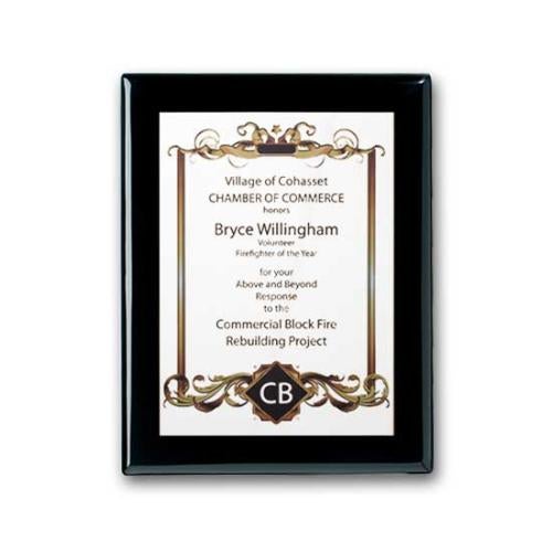 Digitally reproduce your artwork in full color on a white plate, mounted to our ebony piano finished wood plaque.