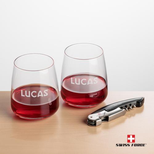 Our Dunhill Wine Glasses and Swiss Force Impressive Wine Tool work together to provide the best wine-drinking experience. Our popular Dunhill 12.25oz Stemless Wine Glasses works great with any vintage. The Swiss Force Impressive Wine Tool functions include a foil cutter, corkscrew, bottle lever, and opener. Packaged in a satin-lined presentation gift box for an elegant gift set for any occasion.