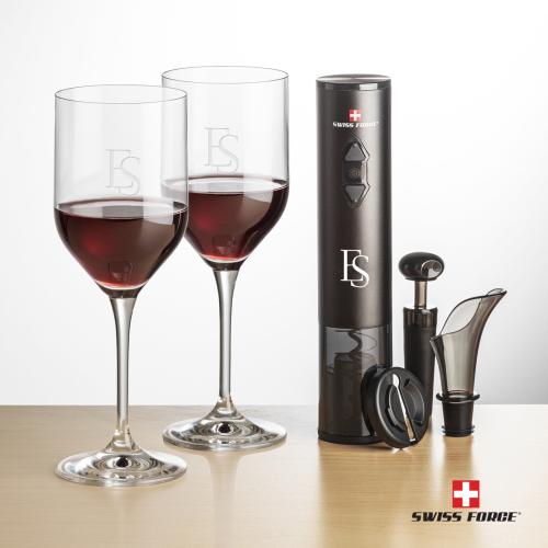 This ultimate duo includes our Belmont Wine, perfect for a light white or red wine, and The Swiss Force Wine Opener Gift Set, which features a battery-operated automatic opener, foil cutter, pourer, and stopper. Packaged in a satin-lined presentation gift box for an elegant gift set for any occasion.