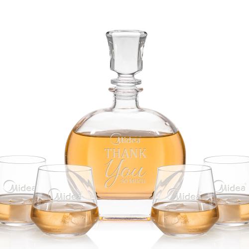 The lead-free crystalline Glendale Decanter showcases a sleek round shape and a thick, sturdy base, blending style with durability. Its tall, striking stopper makes an elegant statement, elevating the aesthetic of any room or bar. Paired with two complementing on-the-rocks glasses, this set offers a refined way to enjoy your favorite spirits.