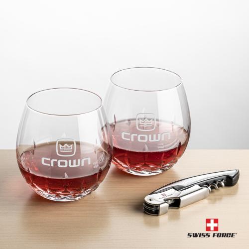 The Templeton Stemless Wine Glasses and Swiss Force Impressive Wine Tool work together to provide the best wine-drinking experience. The Templeton Stemless Wine features a classic balloon shape and smooth rolled rims, perfect for savoring your favorite vintage. Its ornate hand-cut design starts at the base and rises halfway up the glass, adding a touch of sophistication to every sip. The Swiss Force Impressive Wine Tool functions include a foil cutter, corkscrew, bottle lever, and opener. Packaged in a satin-lined presentation gift box for an elegant gift set for any occasion.