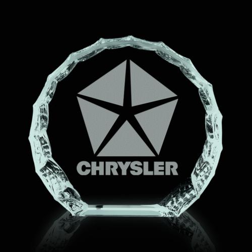 The freestanding 4" Round Iceberg in .75" jade glass features hand chipped and polished edges. Given the limited etching area, the piece is best suited to simple, bold artwork without fine detail. Also available in starfire glass.