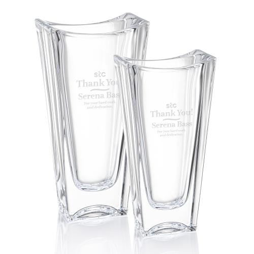 Contemporary Crystalline Vase with bowed rectangular top and oval opening. A Great Gift Idea. Matching bowl available. 2nd position etch optional.
