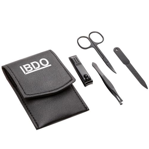 Pamper yourself with our Torello 4pc Compact Personal Care Kit. This kit includes nail clippers, an eyebrow tweezer, a nail file and eyebrow scissors all packed in a leatherette pouch. Perfect for travel, this kit provides self-care on-the-go.