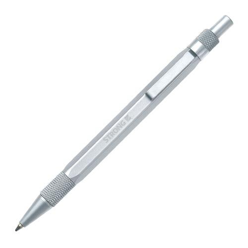 Metal click-action ballpoint pen with satin silver trim and textured grip.