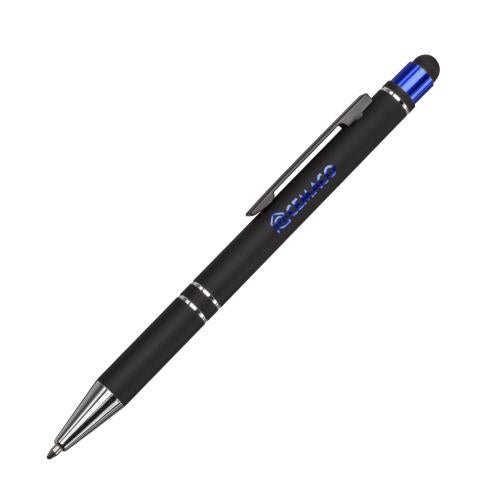 The Scroll Aluminum Ballpoint Pen with Stylus features a matte black barrel with polished chrome accents and tip. The laser-engraved chrome logo matches the plunger color and finish.